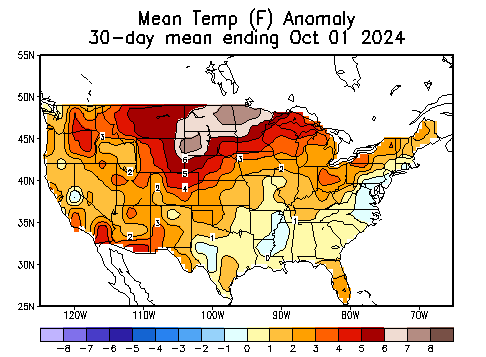 September was warmer than most years, with a temperature anomaly 4 to 5 degrees higher than usual.