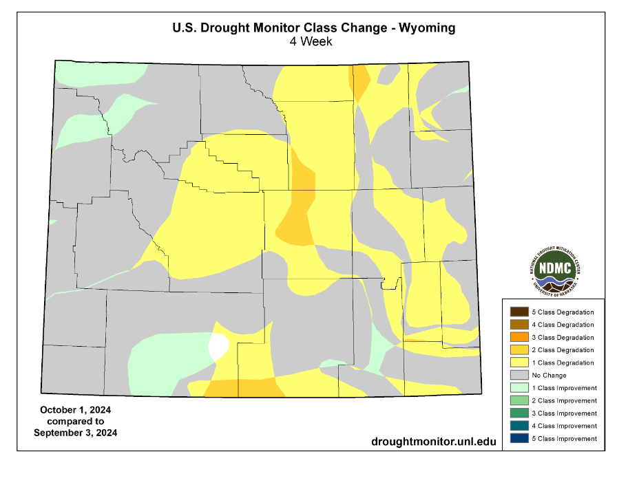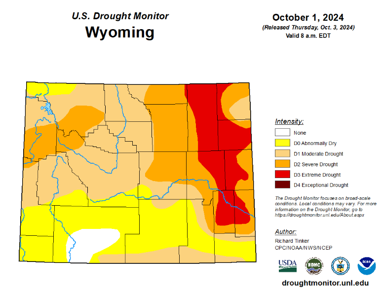Most of Sheridan County is in D2, Severe Drought. This extends south of Sheridan County. Nearly all of Wyoming experiencing some level of drought.