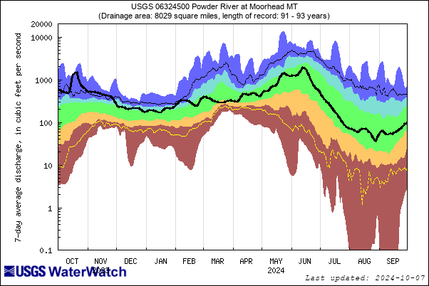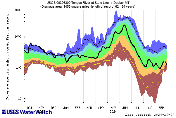 These graphs give context to stream flow percentile classes. The selected USGS stream gauges are on the stateline with Montana, being the downstream end of the Tongue and Powder within our region. The flow represent average 7-day flows. The vertical axis is logarithmic meaning it goes up by 10x for each major tick mark.
