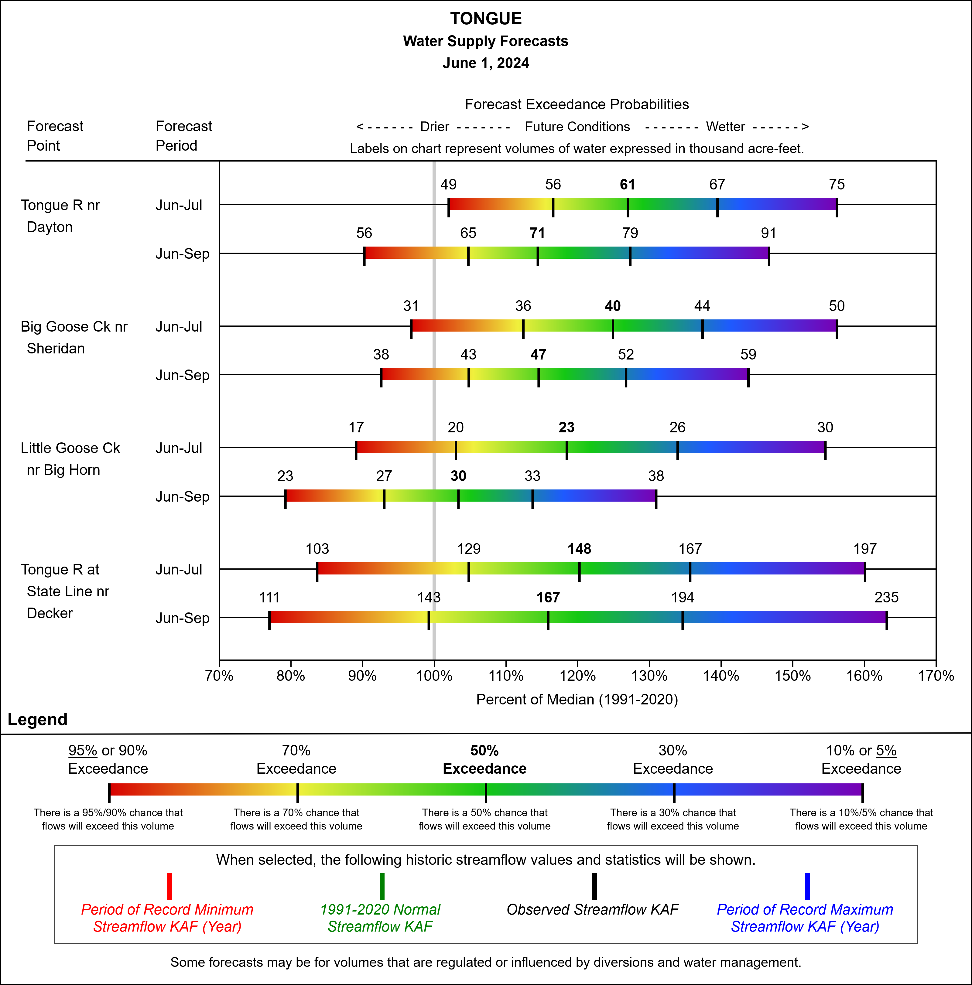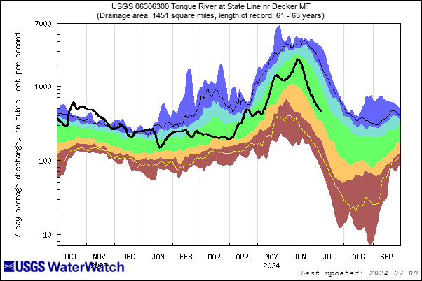 All sites in the Tongue River watershed have above a 70% chance of exceeding median flows for both the short-term and long-term forecast. We can expect flows to be higher than normal, with a 50% chance of exceeding 110-120% of median at most forecast points.