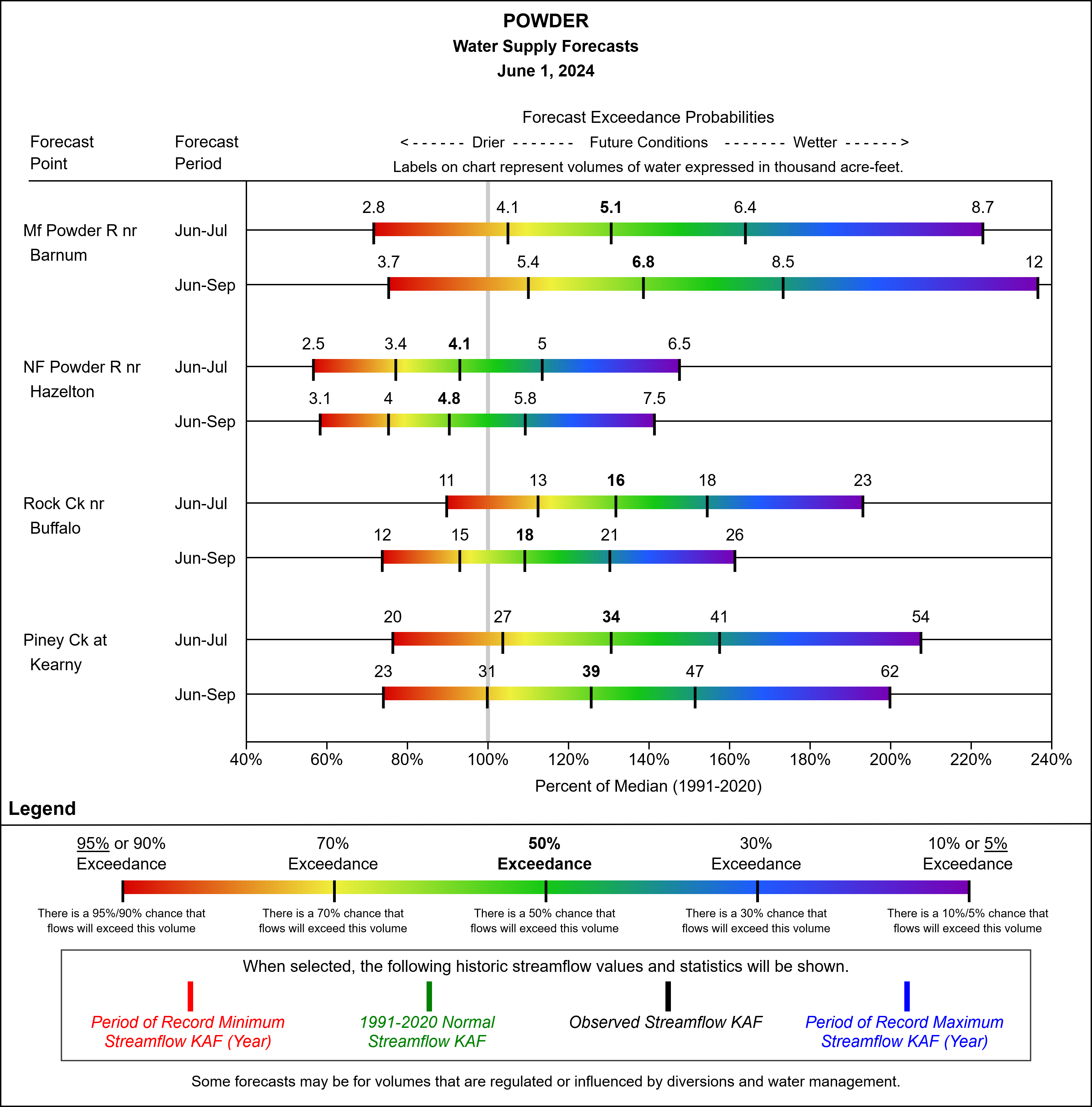 The June to July and June to September forecast has above a 70% chance that flows will exceed median for most sites. Flows have a lower chance of exceeding median at the North Fork of the Powder River near Hazelton, where there is less than a 50% chance of flows exceeding median. However, elsewhere in the Powder River watershed, flows are expected to be at or higher than normal.