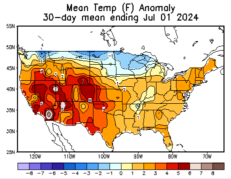 June was warmer than most years, with a temperature anomaly 2 to 3 degrees higher than usual.