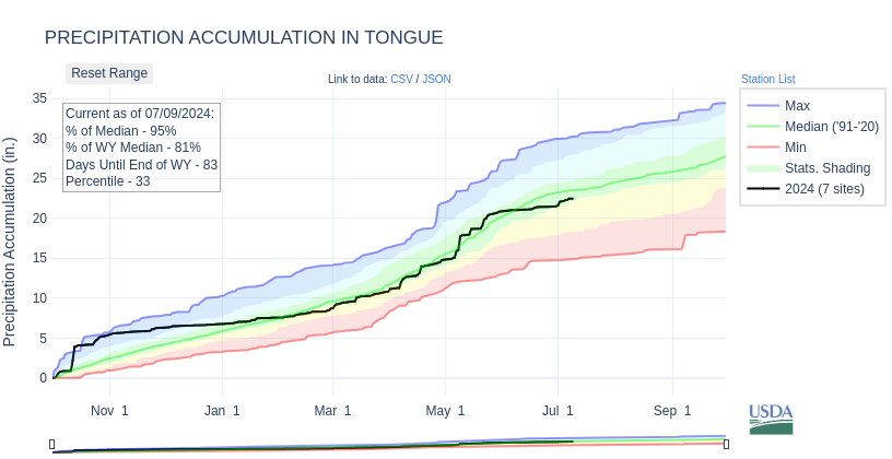 Instead of combing the internet and clicking a million links to learn about water supply in Sheridan County, let us do the work for you! This report compiles many trustworthy sources into an easy-to-read and access report. It includes information about streamflow, snowpack, drought, soil moisture, and precipitation for both the Tongue and Powder Rivers. This report is a one-stop shop for information that can help you be aware of water in Sheridan to make decisions for your ranch and your land.