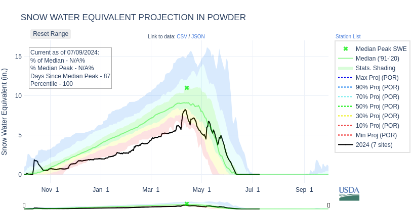 Snow Water Equivalent (SWE) is at 0 inches, which is normal for this time of year. Precipitation accumulation is at 95% of median, which is within the normal range. This represents a drier than normal June, which moved precipitation accumulation from above average in May to the bottom of the normal range.