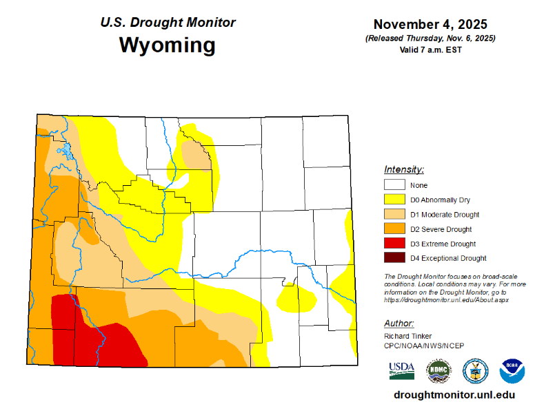 Sheridan county has some abnormally dry conditions in the Big Horns, along the western edge of the county. More than half of Wyoming experiencing some level of drought, but it is reducing from last month.