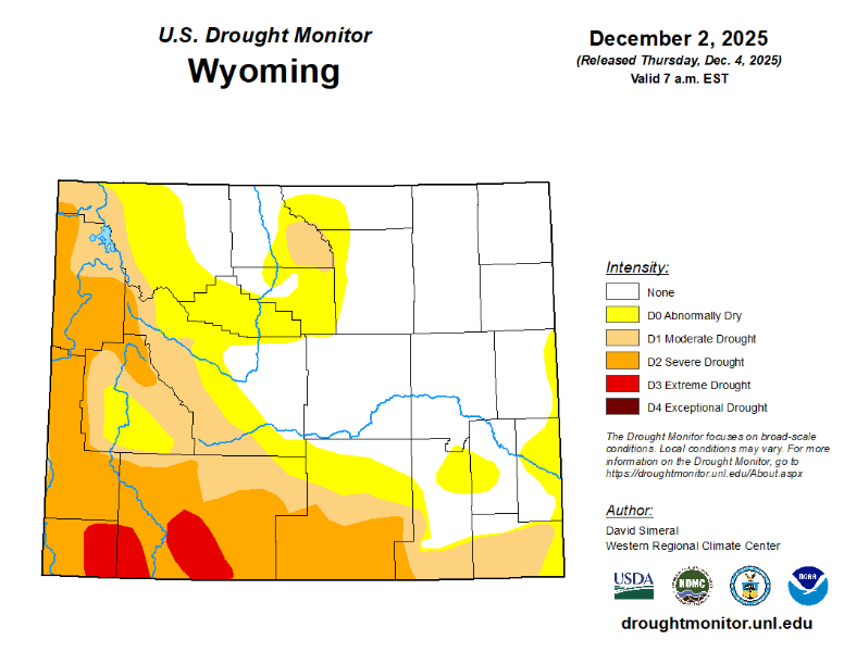 Sheridan county has some abnormally dry conditions in the Big Horns, along the southwestern corner of the county. About half of Wyoming is experiencing some level of drought, but it is reducing from last month.