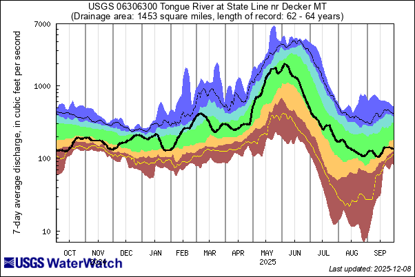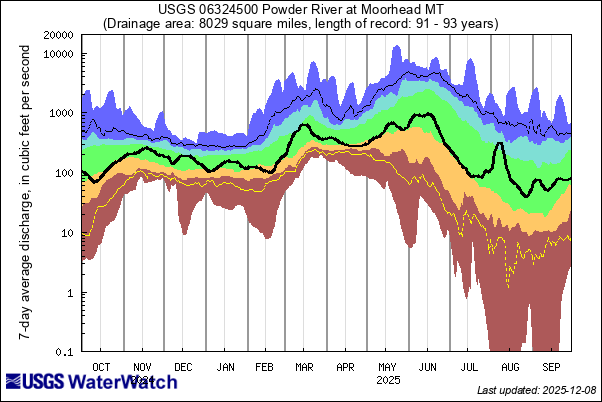 These graphs give context to stream flow percentile classes. The selected USGS stream gauges are on the stateline with Montana, being the downstream end of the Tongue and Powder within our region. The flow represent average 7-day flows. The vertical axis is logarithmic meaning it goes up by 10x for each major tick mark.