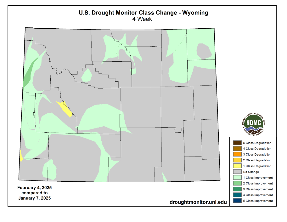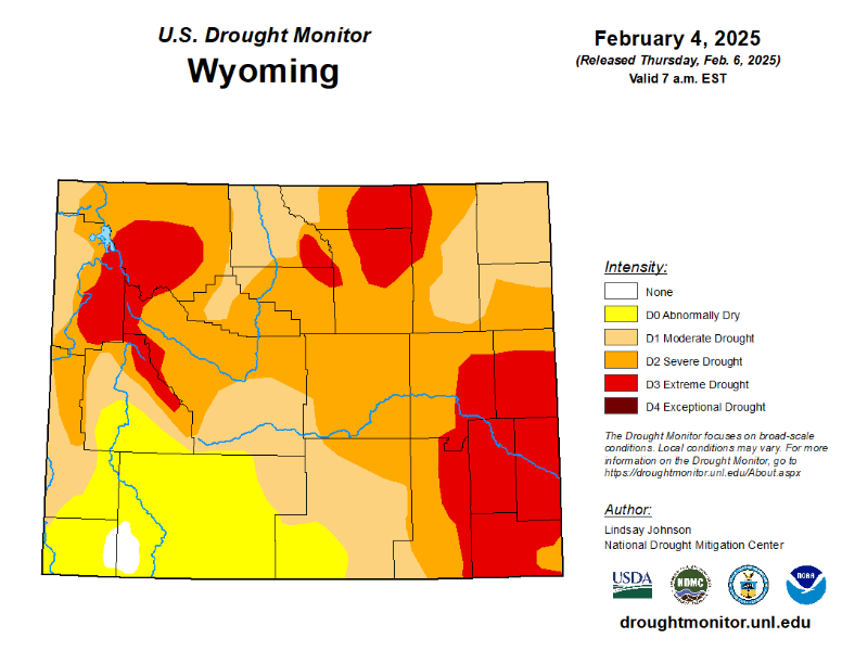 Sheridan county has seen drought levels improved compared to January. Western Sheridan County is in Moderate and Severe Drought. East of the interstate in Sheridan County is in an Extreme Drought. This extends south and east of Sheridan County. All of Wyoming experiencing some level of drought, but improving.