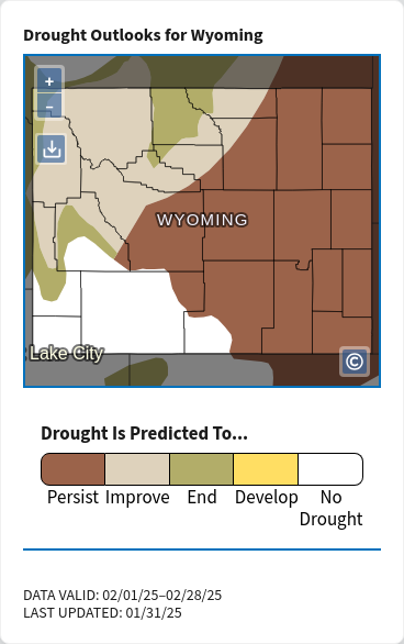 Looking into February, NOAA reports: that the drought will "improve" or "end" in most of Sheridan County. Half of Wyoming the drought is forecasted to persist.