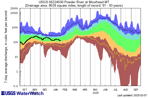 These graphs give context to stream flow percentile classes. The selected USGS stream gauges are on the stateline with Montana, being the downstream end of the Tongue and Powder within our region. The flow represent average 7-day flows. The vertical axis is logarithmic meaning it goes up by 10x for each major tick mark.