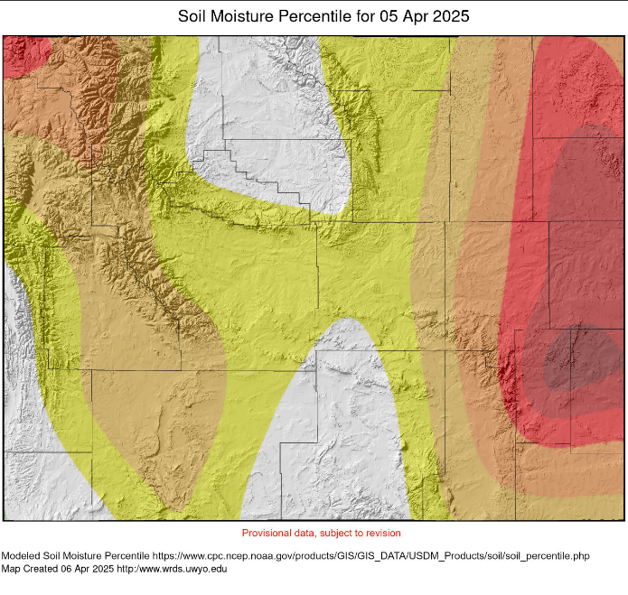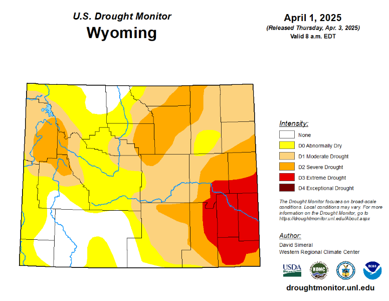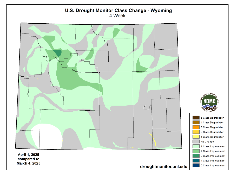 Sheridan county continues to see drought levels improve compared to March. Western Sheridan County is in Abnormally dry and Moderate Drought. East of the interstate in Sheridan County is in Severe Drought, all of which is an improvement from last month. This extends south and east of Sheridan County. Most of Wyoming experiencing some level of drought, but improving greatly.