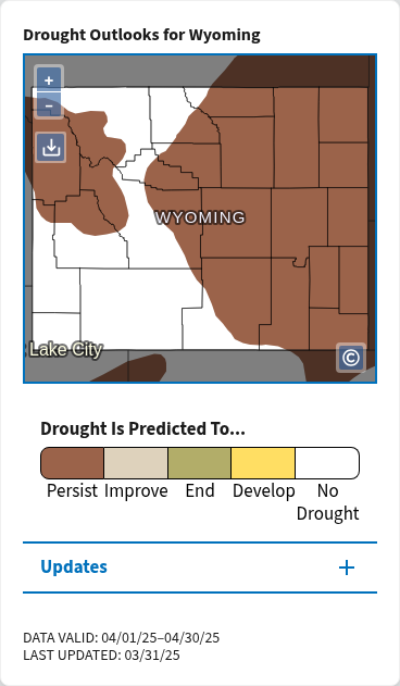 Looking into March, NOAA reports: that the drought will "persist" in most of Sheridan County. Half of Wyoming the drought is forecasted to persist.