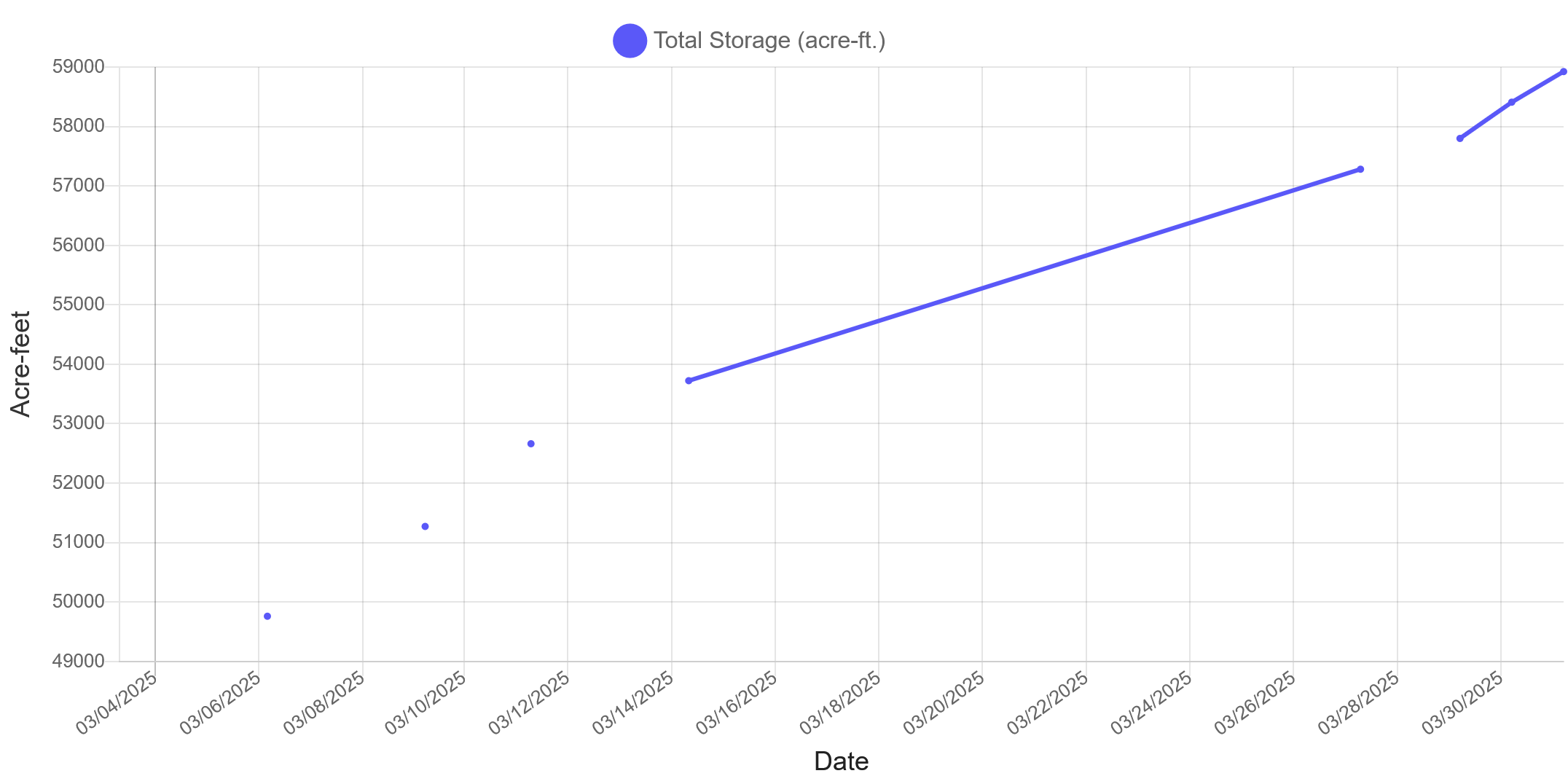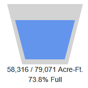 Water levels have started to increase from the last month, up to 58,306 acre-feet. The reservoir is 73.8% full.