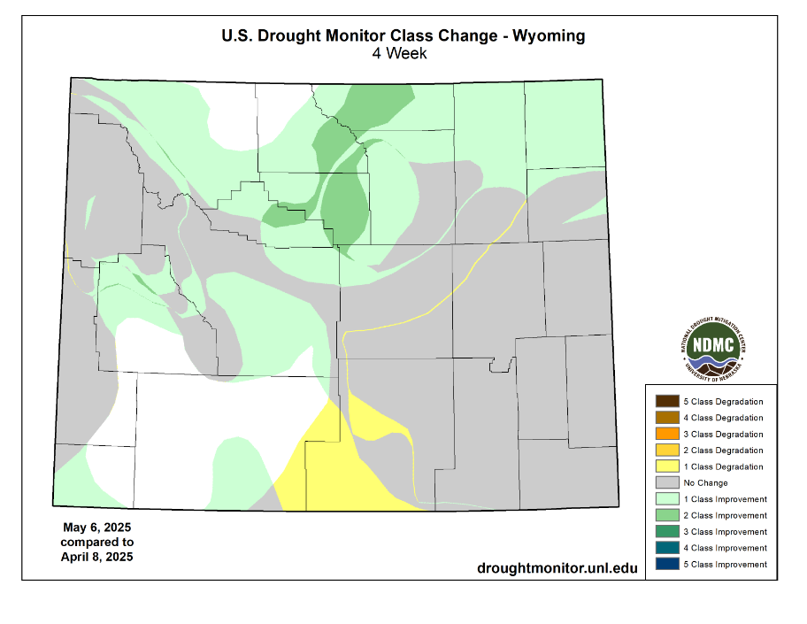 Sheridan county continues to see drought levels improve compared to April. Eastern Sheridan County is in Abnormally dry conditions while the rest of the county is not in a drought. About half of Wyoming experiencing some level of drought, but improving greatly.