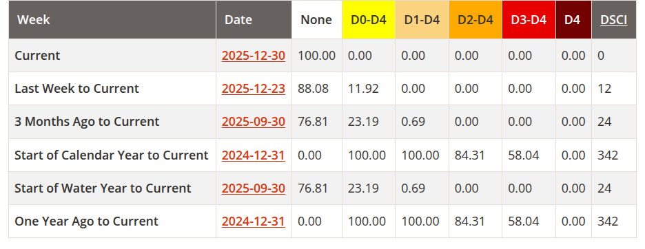 Drought conditions have improved since last month. Three months ago 23.19% of the county was in dry conditions. Now 0% of the county is in dry conditions.