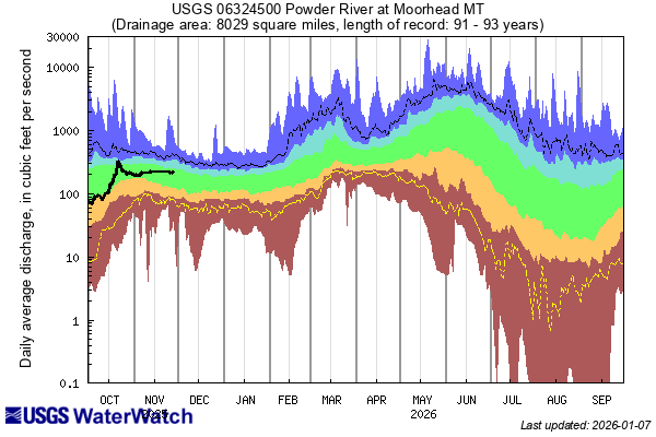 These graphs give context to stream flow percentile classes. The selected USGS stream gauges are on the stateline with Montana, being the downstream end of the Tongue and Powder within our region. The flow represent average 7-day flows. The vertical axis is logarithmic meaning it goes up by 10x for each major tick mark.