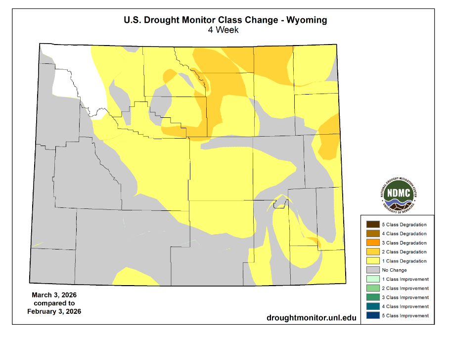 Over the past month, approximately three-quarters of Sheridan County experienced a Class 2 Degradation. Statewide, drought conditions worsened compared with last month.
