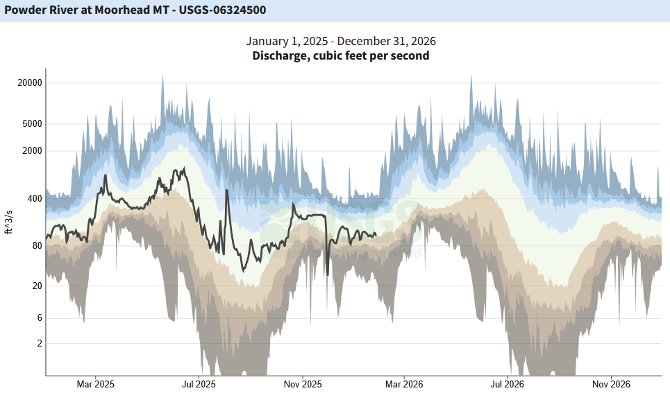 These graphs give context to stream flow percentile classes. The selected USGS stream gauges are on the stateline with Montana, being the downstream end of the Tongue and Powder within our region. The flow represent average 7-day flows. The vertical axis is logarithmic meaning it goes up by 10x for each major tick mark.